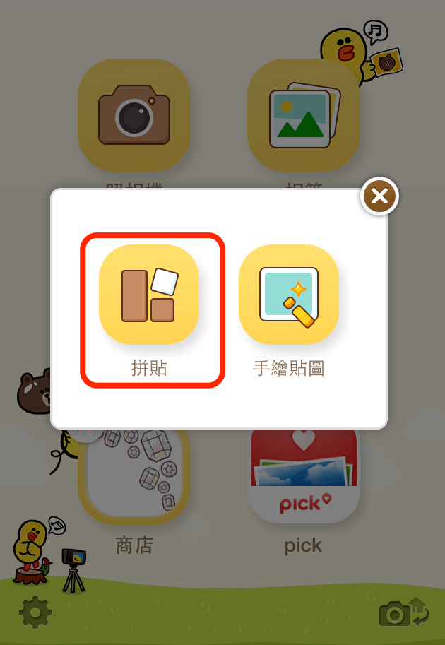 首先,從LINE camera首頁點選「拼貼+」圖示,出現「拼貼」、「手繪貼圖」後點選「拼貼」。