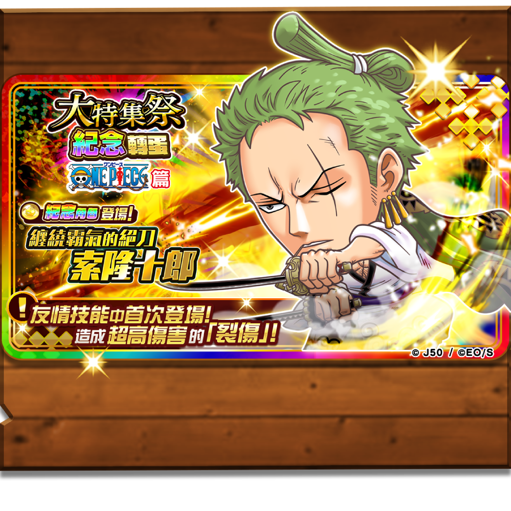 由LINE GAME與日本WonderPlanet Inc. 共同合作的消珠策略RPG手機遊戲,本次將以紅遍全球的超人氣漫畫『航海王』為主題,舉辦集結作品中經典喬段的大特集祭特別活動。而這次的主題將聚焦在懸賞獎金突破1億的眾多新人海賊,也就是人稱「最可怕的世代」總共11名「超新星」角色之間的故事。因此除了主角魯夫之外,草帽一夥的索隆將換上全新衣裝成為「纏繞霸氣的絕刀 索隆十郎」,並與「尤斯塔斯・基德」、「卡波涅・培基」、「X・多雷古」在內的眾多超新星一起活躍於戰場上!
