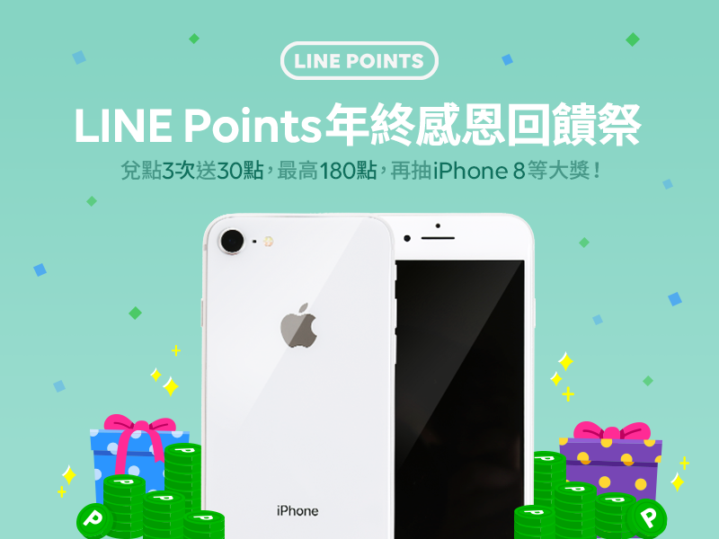 只要在2018.1.14 (日)前將HAPPY GO、OPENPOINT、亞洲萬里通、UUPON、得易Ponta、中華電信歡樂點等六家通路點數兌換成LINE Points,就可額外獲得最高180點!再抽iPhone 8等超級好禮