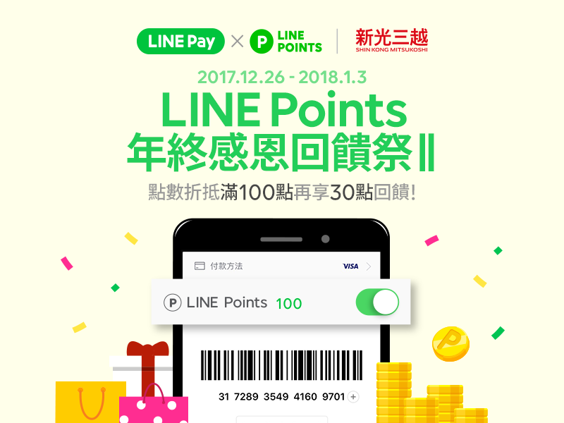 LINE Points與LINE Pay和新光三越聯合推出年終感恩回饋祭第二彈!只要在活動期間內到新光三越消費用LINE Points點數折抵滿100點,就可再得到點數回饋30點!形同一次省下了130元,也太划算了吧~~