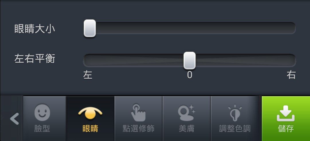 眼睛 - 自動或手動辨識眼部,調整大小與左右平衡。