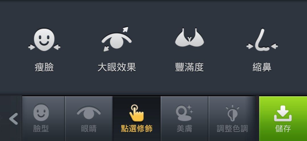 點選修飾 - 選取局部,以手指推移的方式逐漸調節大小,瘦臉或是大眼,