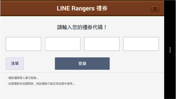▼LINE Rangers 銀河特攻隊設定>禮券>輸入16 碼序號(大小寫需一致)>點選相對應活動>成功後回到遊戲即可獲得