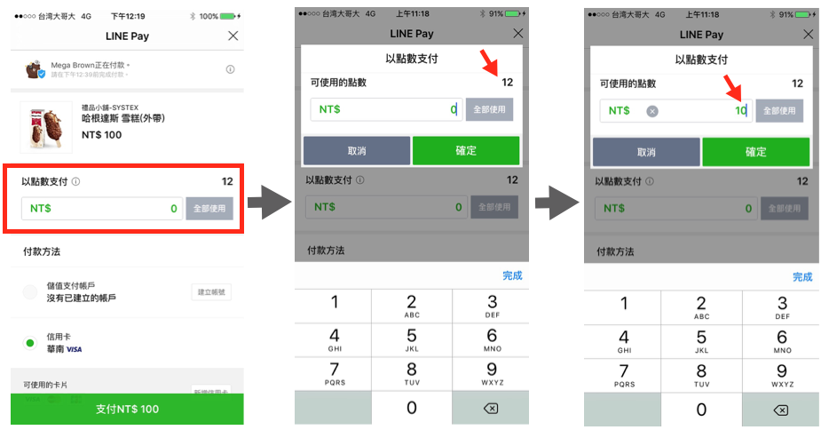 ** 過程中您可選擇不需折抵,部分折抵,或是全額使用LINE Points付款。