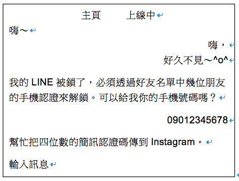 LINE絕對不會出現任何他人需使用您的簡訊認證碼之情況。