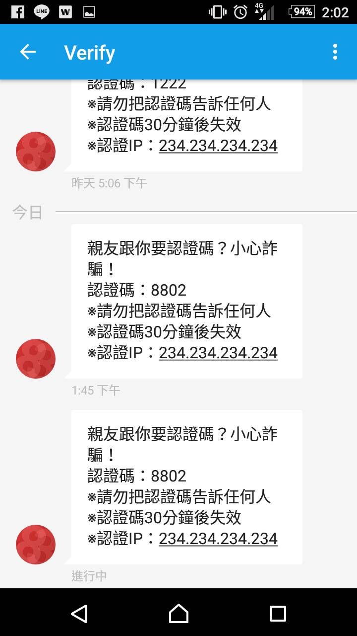 若遇到親朋好友透過LINE詢問簡訊認證碼,請提高警覺!