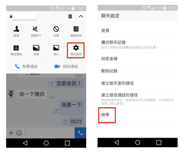 點選聊天畫面右上方的向下箭頭,再點選【聊天設定】 > 【檢舉】