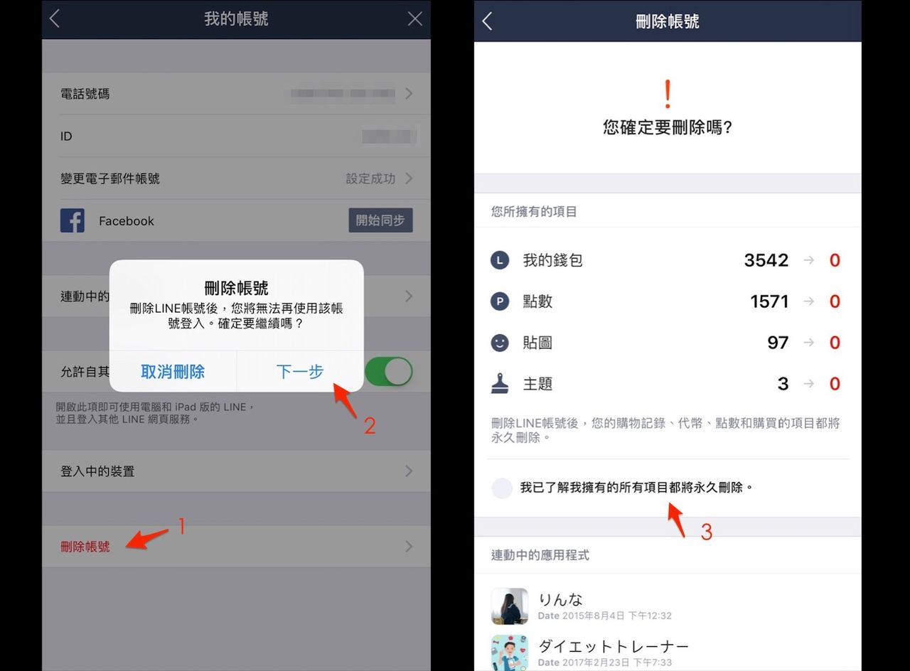 自行刪除帳號後,您的好友名單、聊天記錄、代幣、點數、購買項目,和連動中的應用程式都將永久刪除。即便來信客服,也沒有辦法復原的呦!