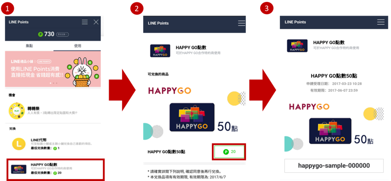 3. 使用LINE Points 20點兌換為HAPPY GO 50點→獲得兌換序號點數券
