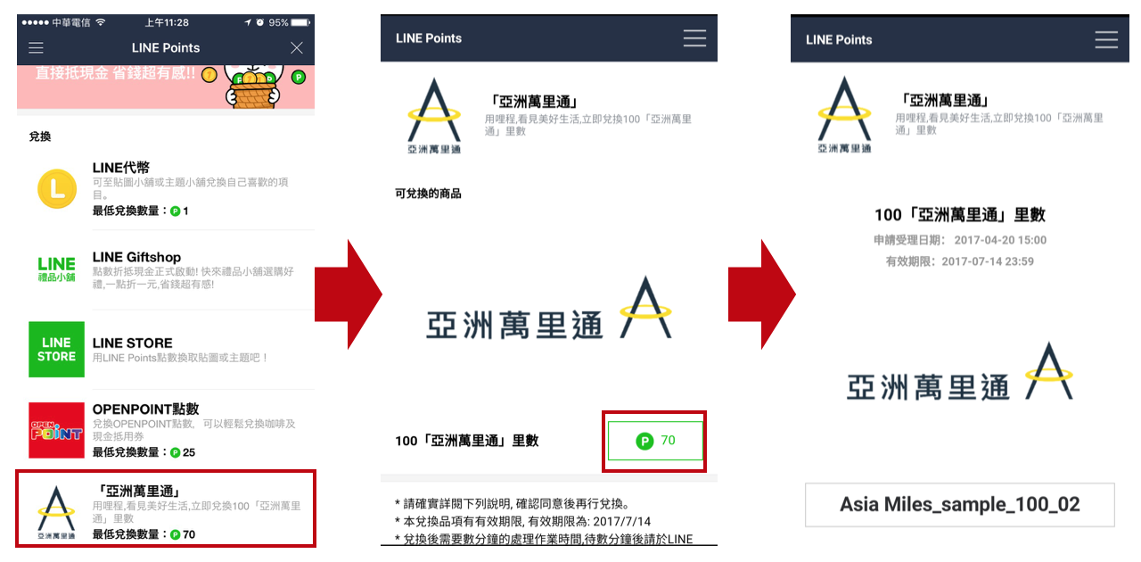 3. 使用LINE Points 70點兌換為 100「亞洲萬里通」里數→獲得兌換序號點數券