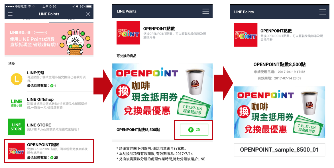 3. 使用LINE Points 25點兌換為OPENPOINT 8500點→獲得兌換序號點數券