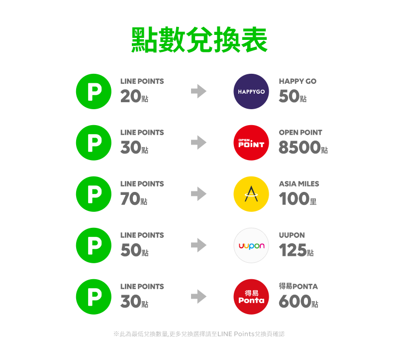 LINE Points一連與六家通路-HAPPY GO、OPENPOINT、「亞洲萬里通」、「UUPON」、「得易Ponta」、Hami Point (原中華電信歡樂點)合作可以互換點數,好想記得LINE Points幾點可以換誰幾點可是總是記不清楚嗎?別擔心,點數兌換表幫你整理好啦~超級清楚的兌點攻略看這邊