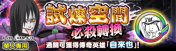 ※ 「試煉空間 激烈連鎖」只能以「一個人冒險」模式進行關卡,並且關卡中無法請求救援。但除了通關第20空間可以獲得傳奇英雄「自來也」之外,其他空間中獲得「必殺寶玉」、「友情寶玉」和「特性寶玉」等超珍貴道具喔!