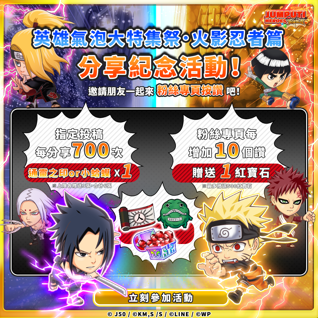 為了紀念大特集祭・火影忍者篇活動登場,在《JUMPUTI HEROES 英雄氣泡》的Facebook官方粉絲團這次也舉辦了「按讚分享活動」!就像忍者在出任務前總是要整理好所有裝備,英雄們也趕快把握這個機會充實自己的行囊吧!只要來Facebook官方粉絲團「按讚粉絲專頁」以及「分享指定投稿」就可以完成活動喔!隨著完成活動的人數越多,到時發送的獎勵也就越豪華喔!全體玩家每人最多可以獲得「3張通靈之印」以及「3個小蛤蟆」、「紅寶石500顆」的豪華大獎!