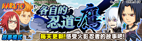 誓言向木葉復仇的佐助之忍道,以及決心尋找過往夥伴的鳴人之忍道。見證他們堅定信念背後緣由的故事模式關卡就在這邊!每天都來觀看故事重溫火影忍者的精彩篇章吧!而且看完故事後還能入手大量的豪華獎勵,錯過可惜喔!
