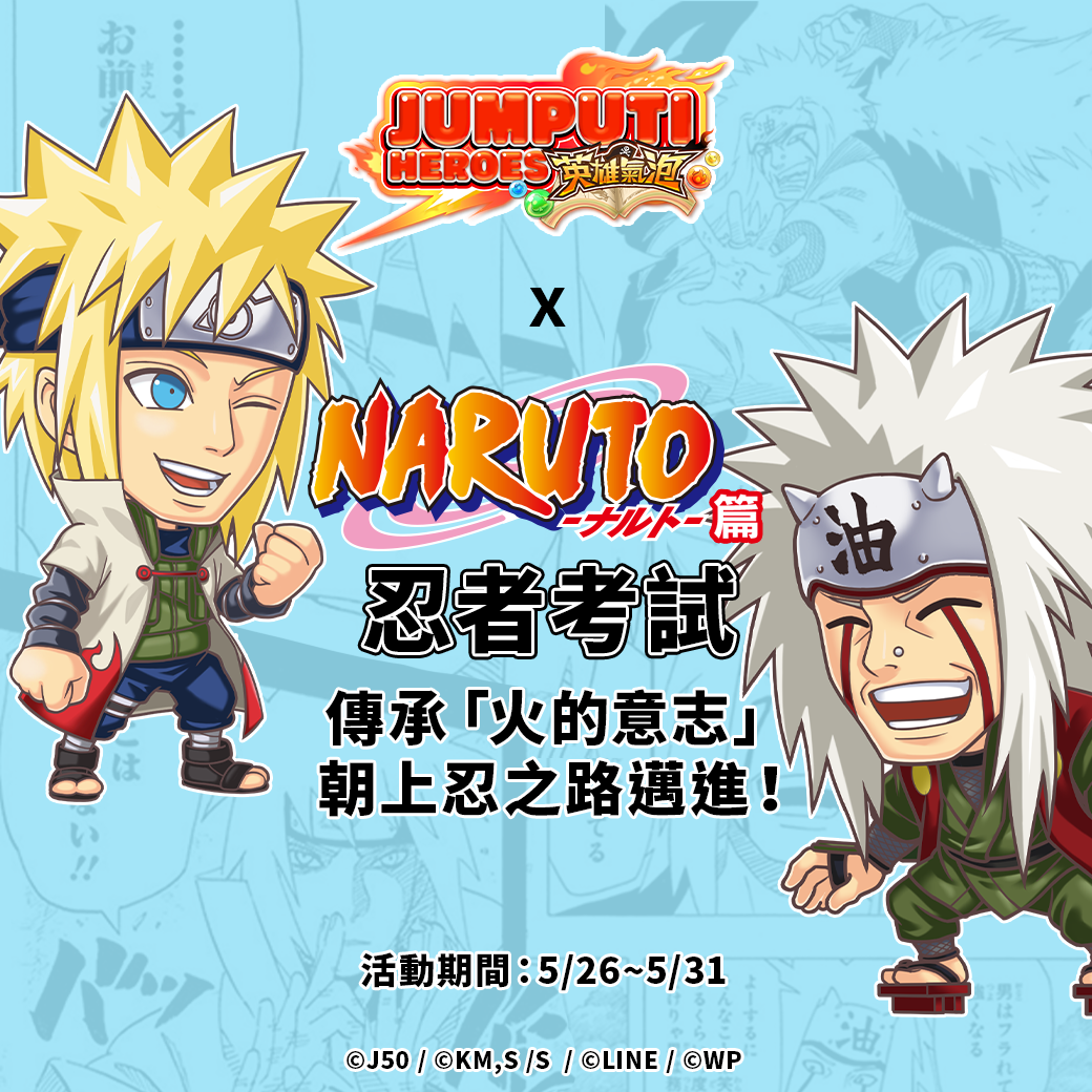 由LINE GAME與日本WonderPlanet Inc. 共同合作的消珠策略RPG手機遊戲《JUMPUTI HEROES 英雄氣泡》中,以重現各大超人名作的經典劇情為核心概念,製作出一連串系列關卡的重點活動大特集祭,這次將圍繞著JUMP週刊上也是首屈一指的超強名作『火影忍者』故事,推出各式各樣關卡與活動讓玩家們重新回味這部人氣強作。除了以主角鳴人的師父「自來也」與父親「波風湊」等人為首的上一代的木葉英雄外,肩負新時代未來希望的幼年版「鳴人」、「佐助」、甚至是遞補佐助成為第七班成員的「祭」與為了守護鳴人挺身而出的「日向雛田」等角色、也會一併來參與這次活動。趕快前往最激烈的戰場,和眾人一起為了和平的未來奮戰!
