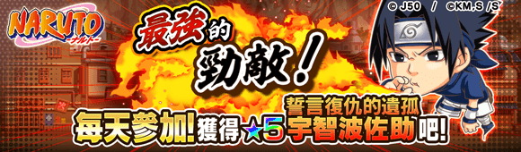 一天一次的修行關卡!每天前往通關就能獲得「誓言復仇的遺孤 宇智波佐助」以及大量強化素!火影忍者角色在關卡中還能享有攻擊力與經驗值UP的加成!不過關卡中的佐助可是會使用燒傷攻擊,組隊推關時可不要太小看他喔!
