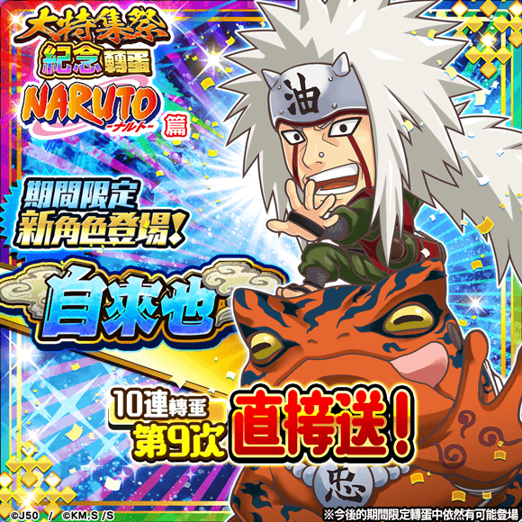 為了紀念大特集祭・火影忍者篇第二彈活動開跑,曾在妙木山修練仙法的「傳說中的三忍」,鳴人的師父「自來也」以及「木葉的黃色閃光」,以忍界最快超高速進行戰鬥的第四代火影「波風湊」,兩名與鳴人都有深厚因緣的超強角色都在紀念轉蛋中登場囉!