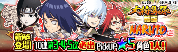 收集火影角色的大好機會!一天限定一次的大特集祭免費轉蛋開跑!在這個必出火影角色的轉蛋中,甚至還有「鬼燈水月」、「祭」、「香燐」、「日向雛田」等全新的火影角色!這麼難得的轉蛋不轉白不轉,天天登入遊戲試手氣,看看能不能將重要的活動轉蛋角色免費帶回家!