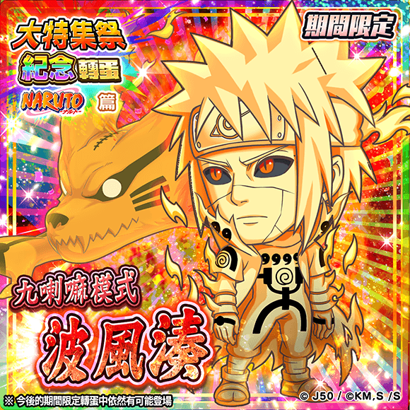 雖然過去曾經因九尾妖狐的封印而備受欺凌,但在與九喇嘛和解後的兩人仍然以無間的默契發揮出強大實力!「九喇嘛模式 漩渦鳴人」在本次大特集祭中登場囉!另外,繁體字版還特別搶先推出「九喇嘛模式 波風湊」,要讓眾人一見木葉黃色閃光的最強實力!當然也不能錯過在第四次忍界大戰中發揮實力的「第五代風影 我愛羅」與「寫輪眼的英雄 旗木卡卡西」!